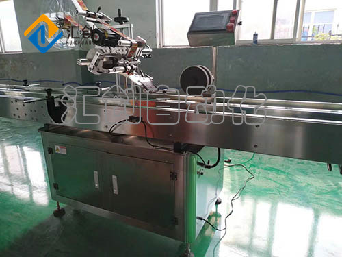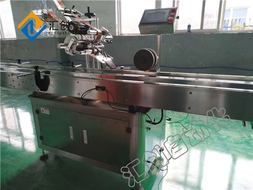 依贵司要求,需要贴单标签于纸箱的一侧,我们推荐使用我司生产的平面贴标机,它由一个贴标机头组成;分别位于输送板链的一侧,扁瓶或方瓶单面贴标时,被贴物经由贴标机输送带进入,由输送线带入贴标区域。进入贴标区域后,视物光纤检测到瓶子,将光电信号传输到PLC,由PLC处理后将输出信号传输到步进电机,由步进电机出标,通过抚标毛刷将标签贴到瓶子上,经过海绵滚轮(加压板使瓶子转起来)抚平标签,贴好标签后的物体由贴标机输送带进入下一流程。