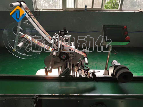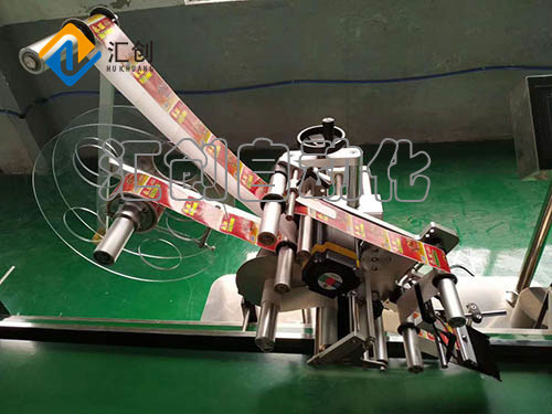 分瓶,使被贴物按需要的间距分离开; 输送物料经过测物电眼时,检测到被贴物; 贴标头步进(伺服)电机转动,标签从剥离板上剥离出标并使标签前端粘贴于被贴物表面,底纸回绕; 测标电眼检测到标签间隙时,标签按设置继续向前伸出预出标长度,送标器步进(伺服)电机停转,出标停止; 被贴物进入卷标装置/抚标装置,标签被平整地卷/压在被贴物上。
